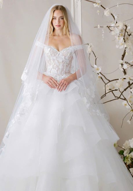 Cathedral length tulle veil with blusher has a floral threadwork embroidered edge.