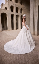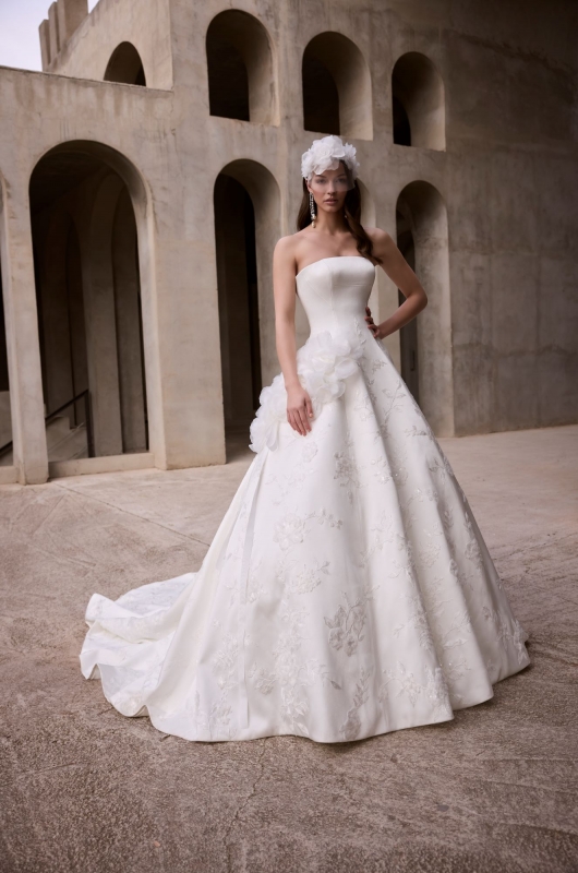 Infused with modern romanticism, our Daphira wedding dress is a strapless duchess satin ball gown that captivates with its princess seam tailoring and delicate interplay of organza and tulle, adorned with sequin-highlighted floral threadwork appliqué. The voluminous silhouette is elevated by a detachable oversized floral appliqué and a sculptural grosgrain ribbon.