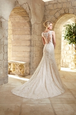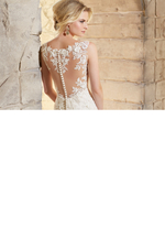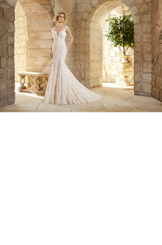 Chantlly Lace Gown Decorated with Venice Lace Appliques and Scalloped Hemline.
