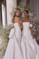 Our Atalanta wedding dress is a fit and flare gown in stretch Mikado, sculpted with princess seams that elongate the body. The strapless neckline has an elegant fold-over design, while the bodice is adorned with beaded lace appliqués. A detachable double-loop embellished bow adds drama to the dress, while the clean train completes the silhouette for effortless impact.