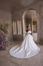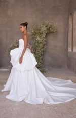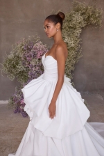 Our Nereida wedding dress is voluminous and romantic with a couture edge. The gown features a strapless draped bodice and basque waist to define the silhouette, accented by detachable puff sleeves and scattered three-dimensional floral details. Crafted in crisp taffeta, the A-line ball gown is finished with a dramatic bubble hem overskirt that's transformative, textural, and undeniably bold.
