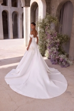 Feminine, architectural, and undeniably romantic, our Ophelia wedding dress features a strapless neckline and princess seams to define the sleek fit and flare silhouette. Detachable off-the-shoulder rosette cuffs add sculptural softness, while 3D floral appliqués define the draped, stretch mikado skirt leading to sleek train.