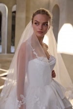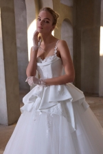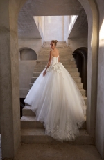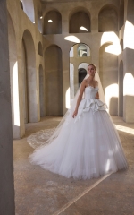 Our Lilah wedding dress is effortlessly modern with a romantic twist. The tulle ball gown captivates with a softly draped crepe bodice and sculpted sweetheart neckline framed by delicate thin straps and cuffed detail. A textural peplum adds dimension at the waist, while floral appliqués bloom across the voluminous skirt, creating a graceful movement that feels both ethereal and editorial.