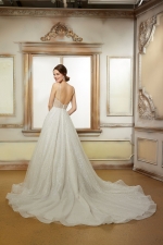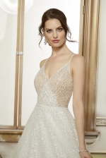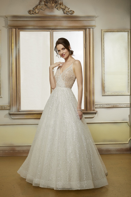 CRYSTAL BEADED STRAPS ON AN ALLOVER SEQUINED NET A-LINE BALL GOWN WITH HORSEHAIR EDGED HEMLINE