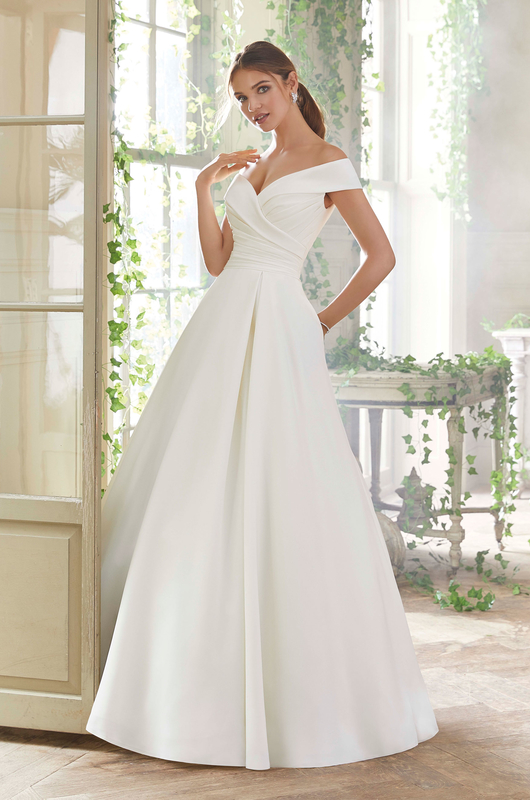 Peau de Soie, Box-Pleated Ballgown with Pockets, with Draped Bodice and Surplus, Off-the-Shoulder Portrait Neckline.