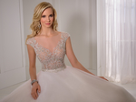 An organza A-line wedding dress with a striking intricately beaded illusion tulle bodice, capped sleeves and a low open back.