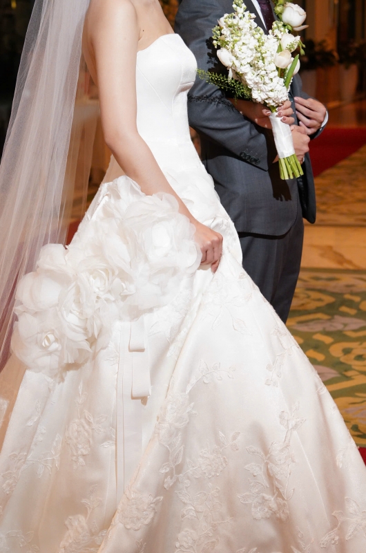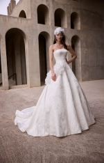 Infused with modern romanticism, our Daphira wedding dress is a strapless duchess satin ball gown that captivates with its princess seam tailoring and delicate interplay of organza and tulle, adorned with sequin-highlighted floral threadwork appliqué. The voluminous silhouette is elevated by a detachable oversized floral appliqué and a sculptural grosgrain ribbon.